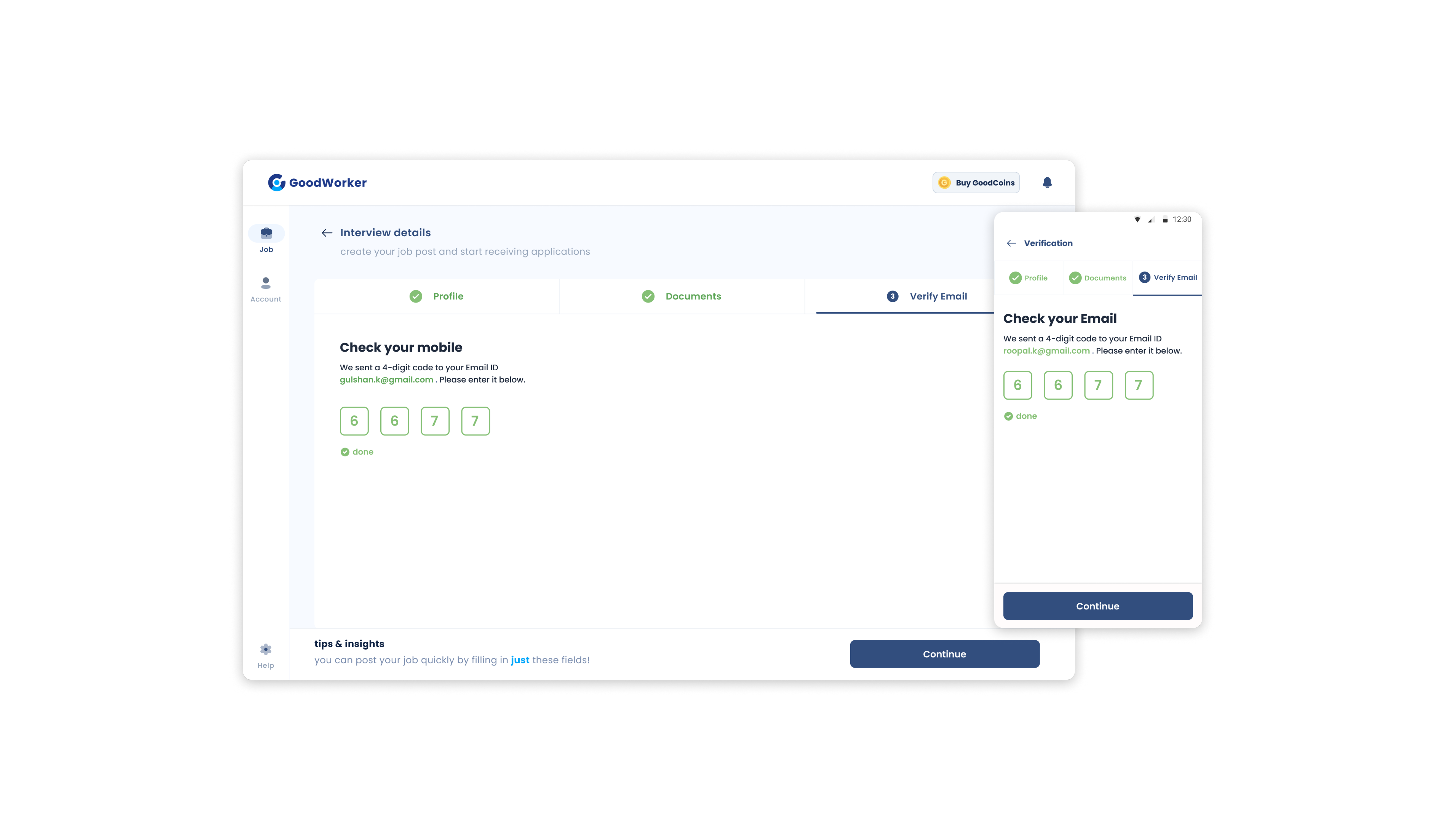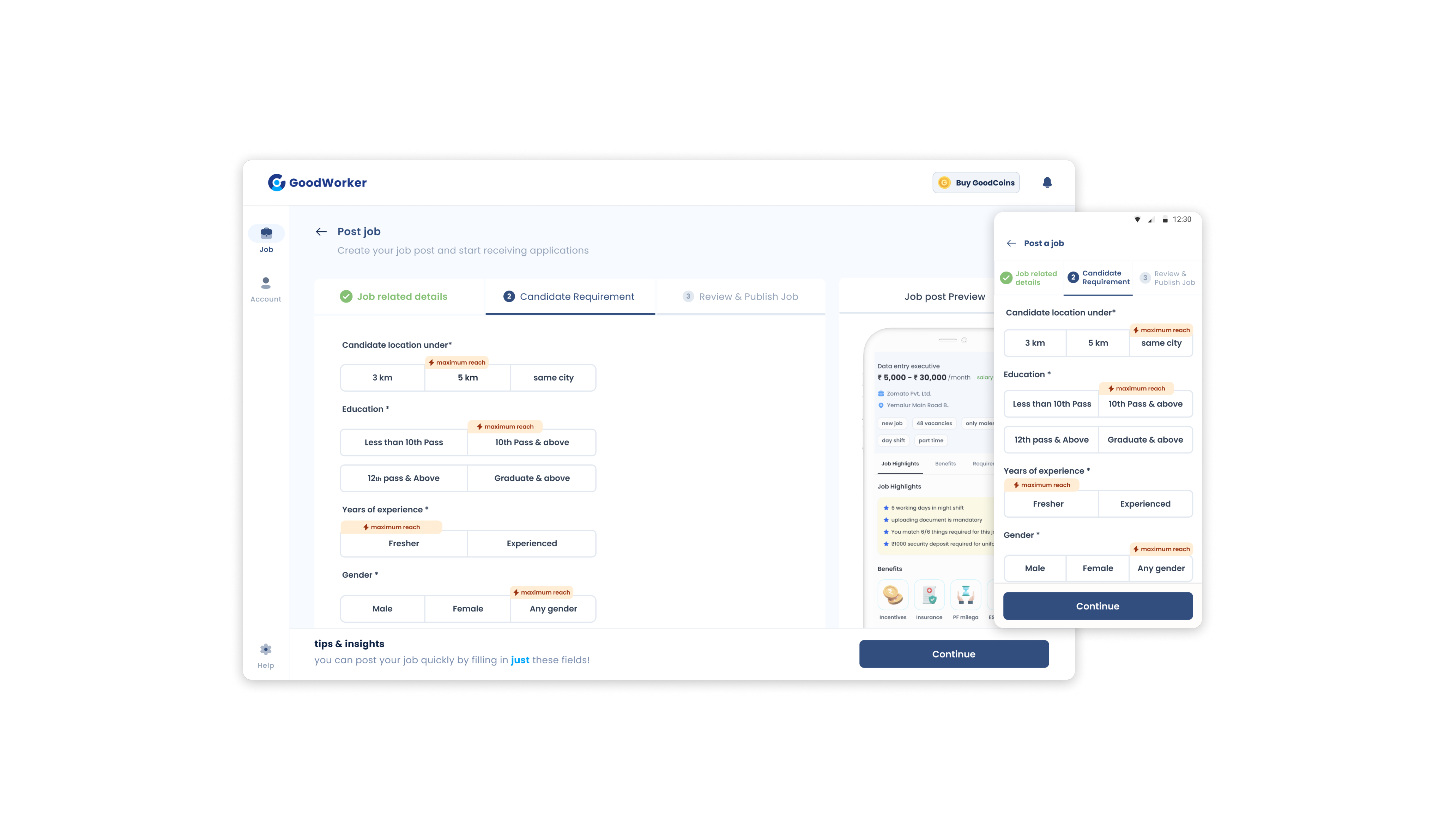 I worked with GoodWorker, a job-matching startup redefining blue and grey-collar recruitment that raised over $23M across multiple rounds. I contributed to the end-to-end design process, shaping product direction and user experience, ultimately delivering 30+ user flows across web and mobile.